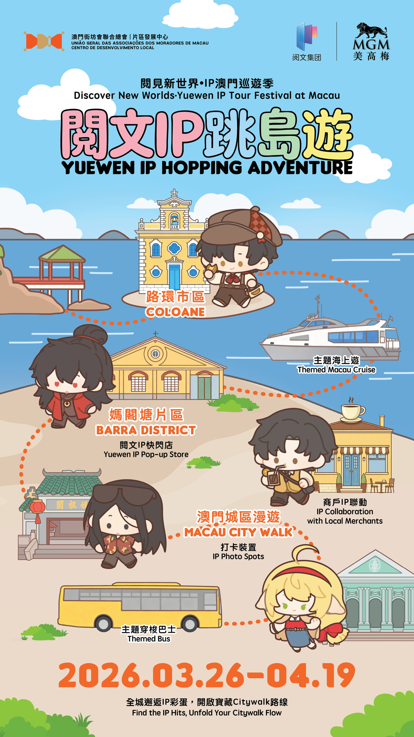 美高梅聯動閱文集團,帶着人氣角色走入澳門街頭,邀您穿梭媽閣塘片區與世遺地標。3月26日至4月19日間,選擇您的專屬方式,開展您與人氣角色的澳門城市漫遊!您可以走進快閃店選購周邊商品,於美獅美高梅視博茶點與「克喵喵」共享主題下午茶,或是坐上閱文IP主題海上遊及主題穿梭巴士,更可參與城市漫遊集章活動,收集景點印章或於聯動商戶消費,即可參加抽獎,贏取限定禮品及主題海上遊船票!